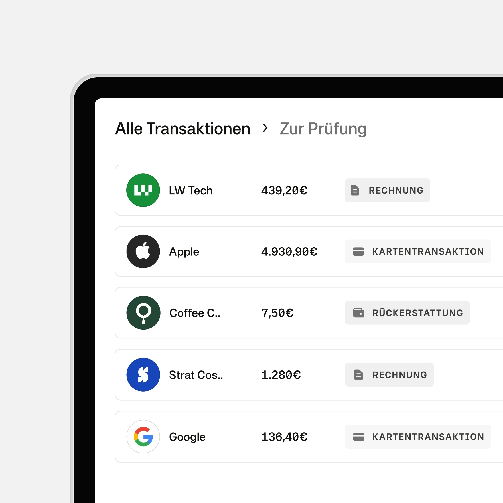Moss sammelt für dich alle Ausgabendaten, von Kartenzahlungen und Erstattungen bis hin zu Rechnungen und Zahlungen – bereit zur Prüfung durch das Finanzteam.