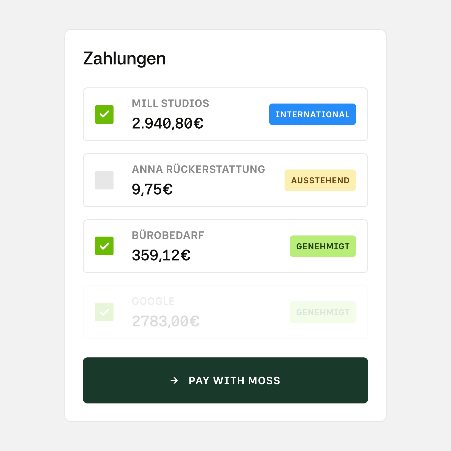 Moss ermöglicht dir Rechnungen und Erstattungen an Mitarbeiter direkt mit Guthaben deiner Moss Wallet zu bezahlen. Lade dazu einfach Guthaben in deine Wallet und nutze dieses für SEPA und internationale Überweisungen in 70+ Währungen.