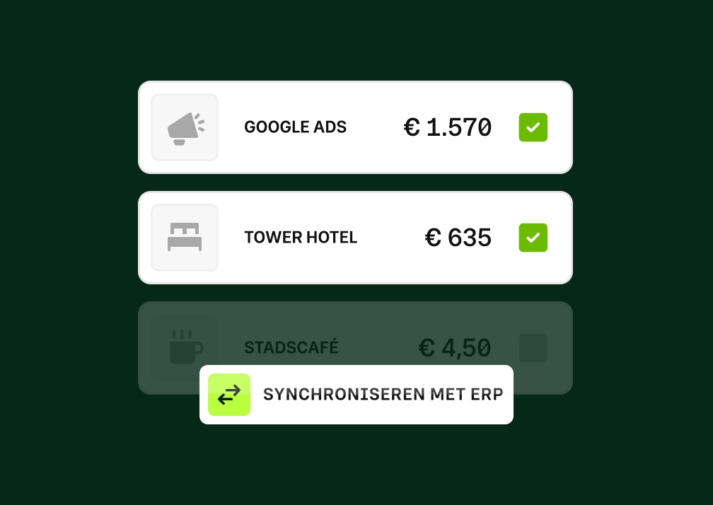 Vooraf geboekte uitgaven en facturen, geëxporteerd naar je boekhoud- of ERP-software via eersteklas integraties: je hebt elke maand een voorsprong.