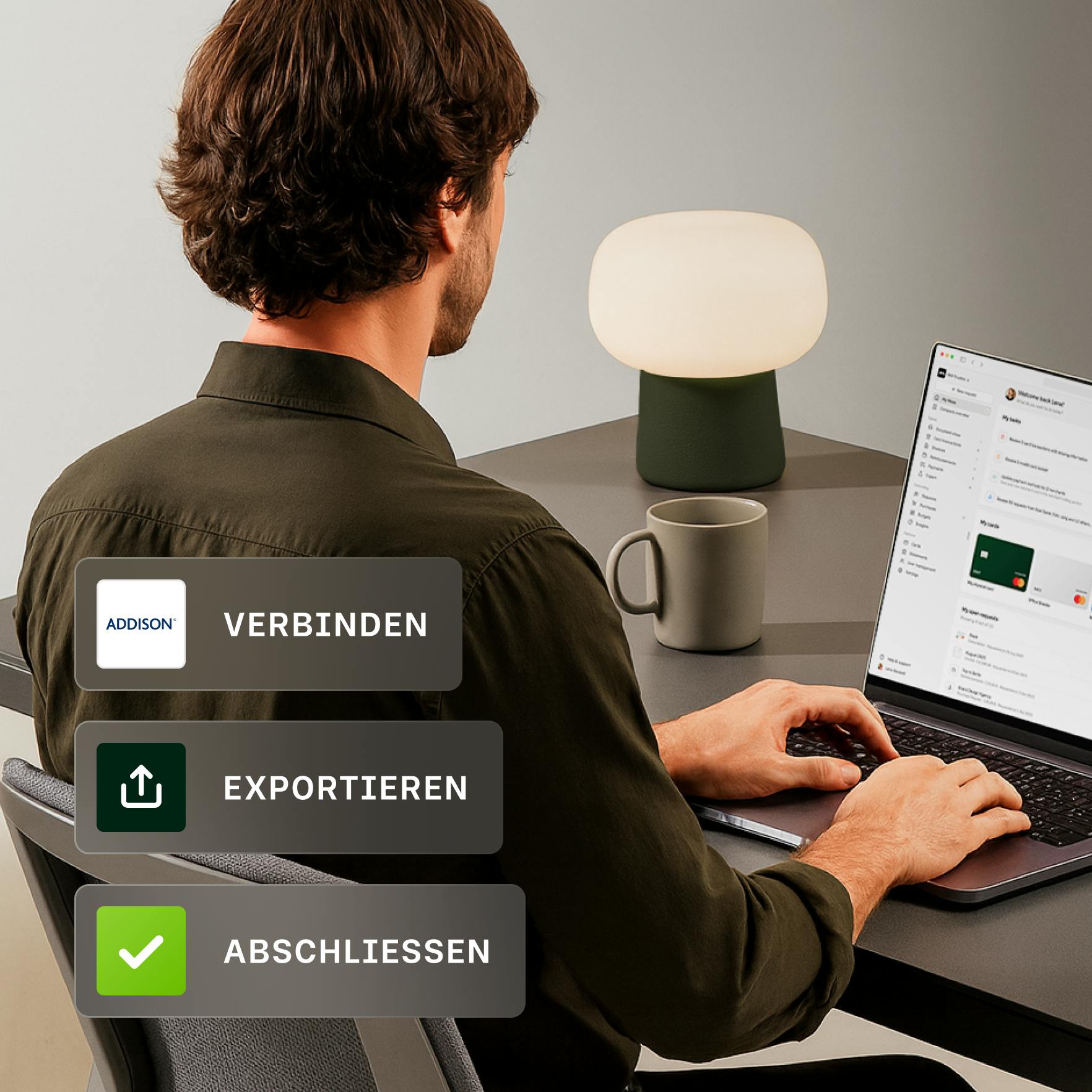 Moss erstellt Addison-kompatible CSV-Exporte für Kartenzahlungen, Rechnungen und Auslagen. Alle Daten sind korrekt formatiert, sodass dein Team sie ohne manuelle Anpassungen in Addison importieren kann.