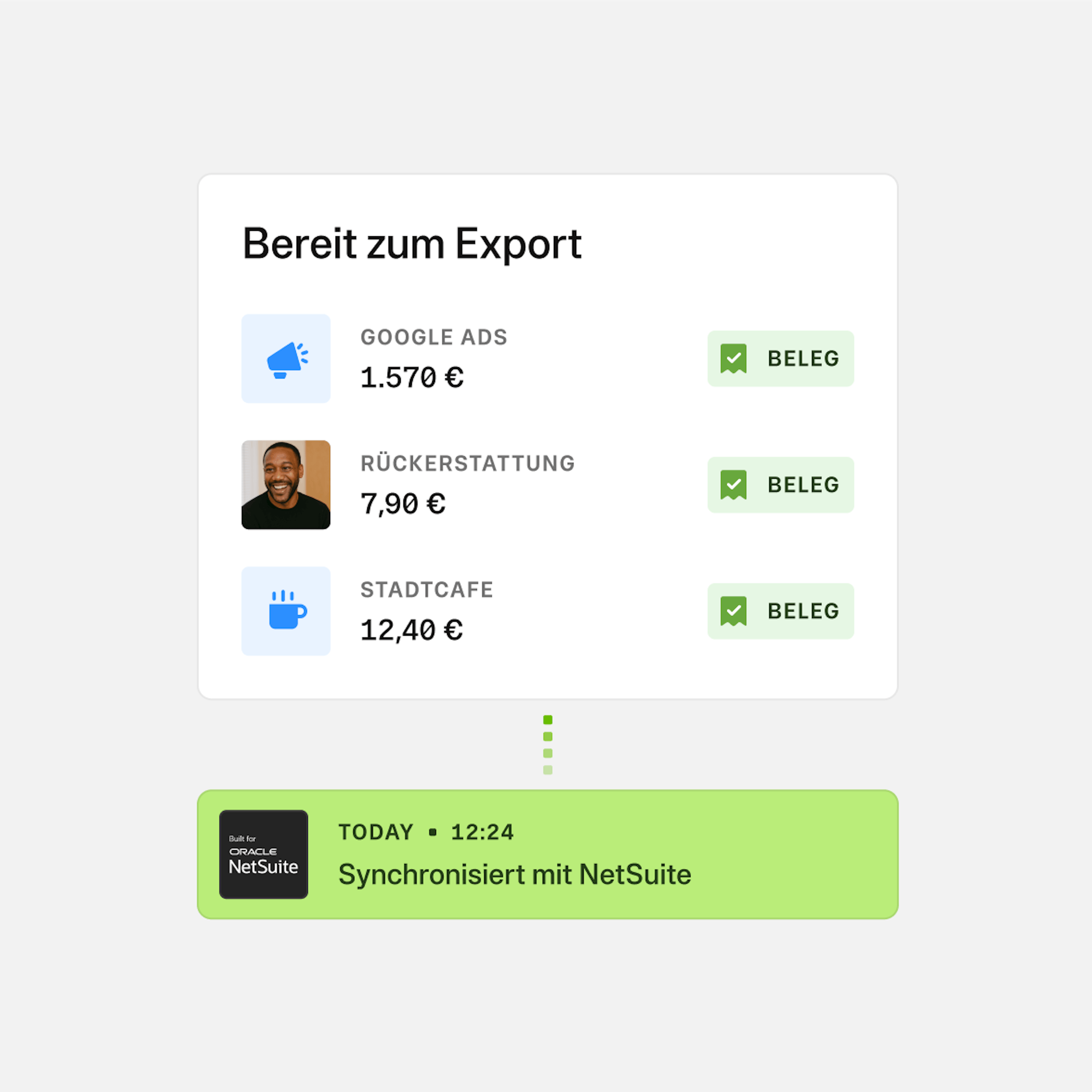 Moss verwaltet alle Ausgabentypen und exportiert sie mit den zugehörigen Belegen direkt nach NetSuite. Kreditorenrechnungen, Kartenzahlungen, Rückerstattungen und Zahlungen sind für die Buchung vorbereitet.