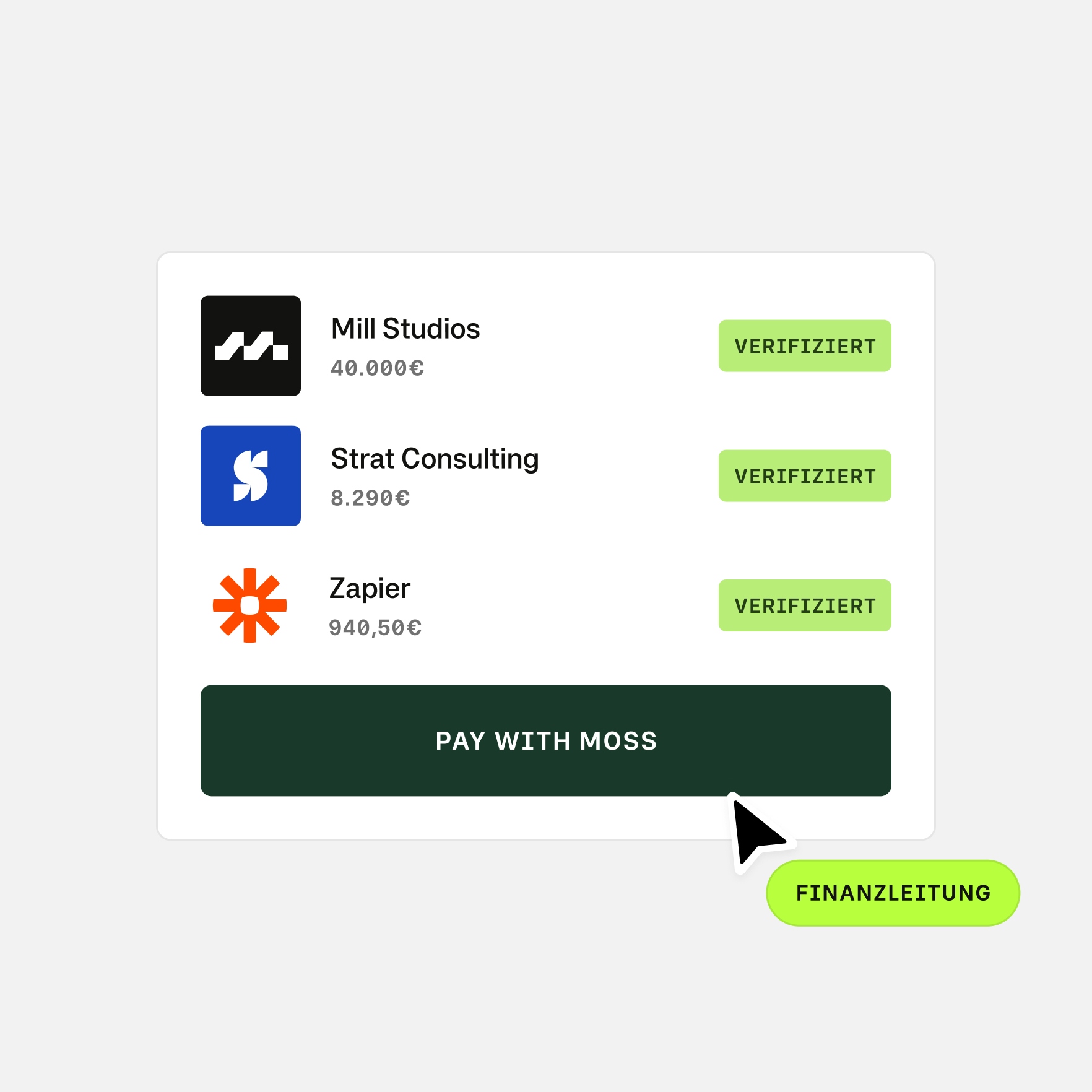 Vorab geprüfte und genehmigte Kaufanfragen können direkt über Moss bezahlt werden, sobald die passende Rechnung in Moss eingeht.