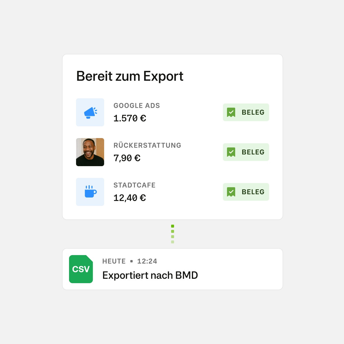 Belege und Rechnungen werden automatisch den richtigen Transaktionen zugeordnet und gemeinsam im BMD-CSV exportiert.