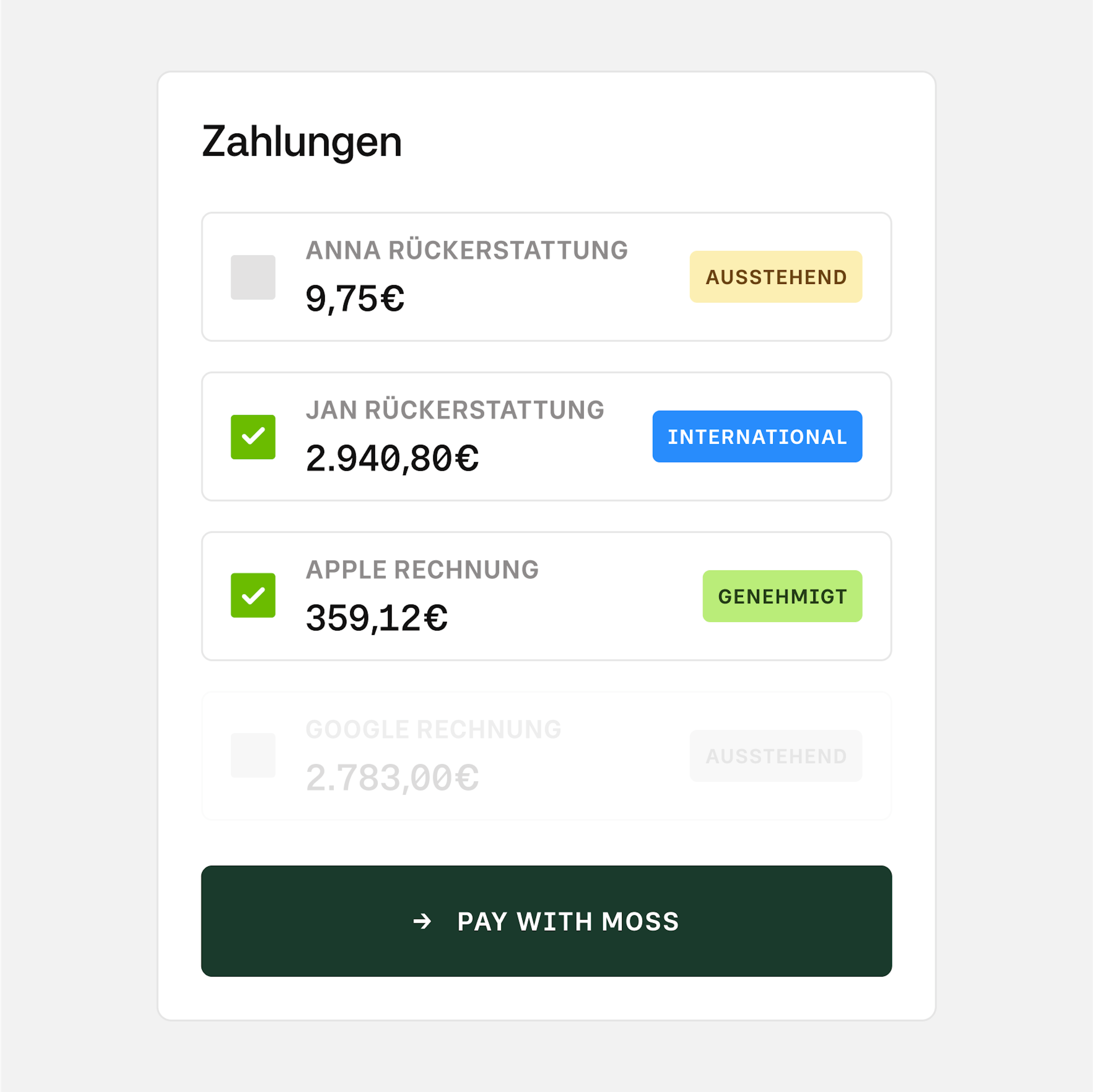 Genehmige Ausgaben und zahle Rückerstattungen an Mitarbeitende direkt in Moss, nach deinem Zeitplan und in jeder Währung. Jederzeit transparent und im Rahmen deiner Richtlinien.