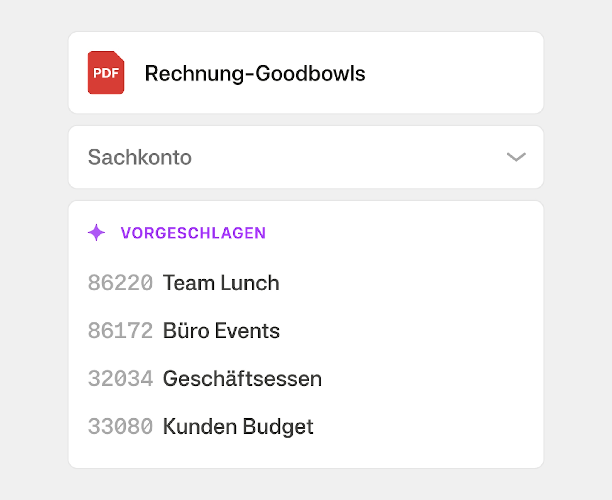 Moss hilft dir jetzt noch schneller, Buchhaltungsdetails zuzuweisen. Wenn Moss einen möglichen Zusammenhang erkennt, zeigt es eine Auswahlliste mit wahrscheinlichen Optionen an. Falls der Vorschlag angepasst werden muss, sind die relevantesten Alternativen sofort verfügbar – das spart Zeit beim Suchen oder Scrollen durch lange Listen. Eine einfache Möglichkeit, Entscheidungen beim Buchen schneller und leichter zu treffen.