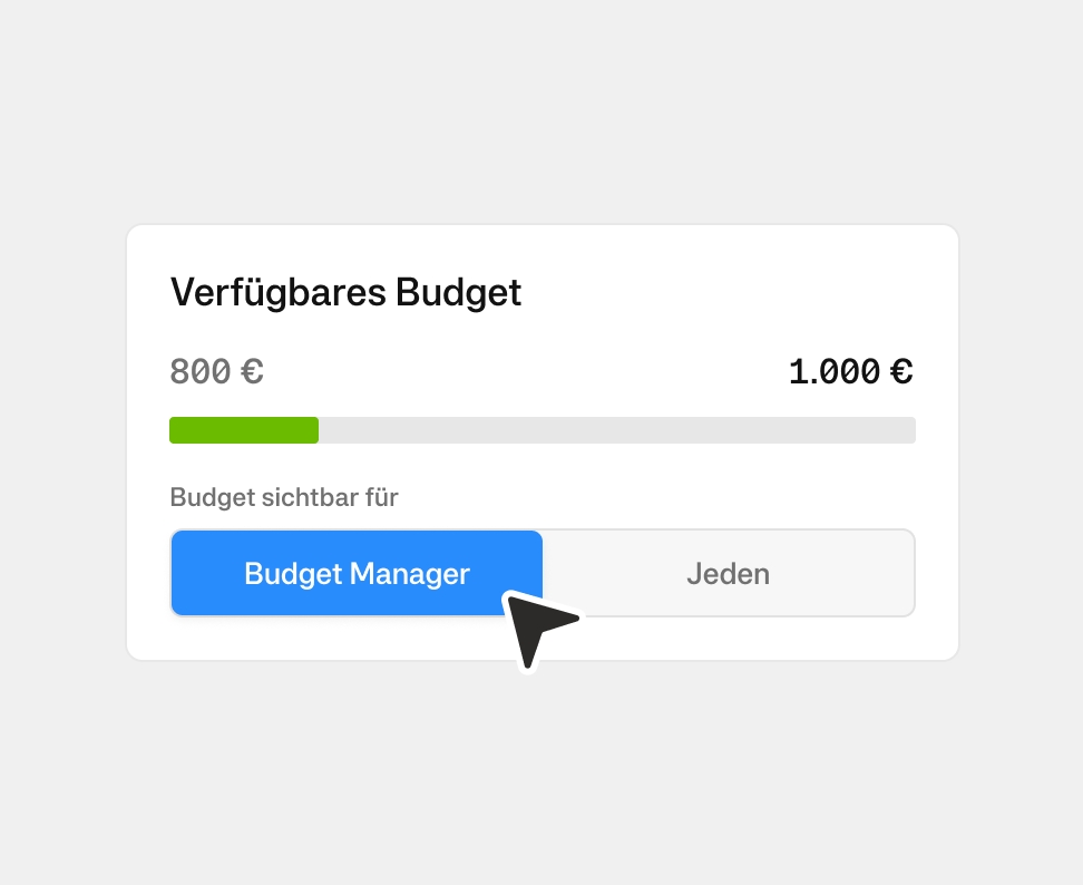Lege einzeln festlegen, wer Budgetbeträge und Ist-Ausgaben einsehen darf. Standardmäßig sehen nur Budget-Manager, deren Vorgesetzte, Admins und die Buchhaltung die Zahlen. Wenn du für bestimmte Budgets mehr Transparenz schaffen möchtest, kannst du sie für alle freigeben. So behalten Mitarbeiter den Überblick über ihre eigenen Ausgaben, ohne sensible Budget-Daten aus anderen Bereichen zu sehen, während Budget-Verantwortliche die volle Kostenkontrolle behalten.