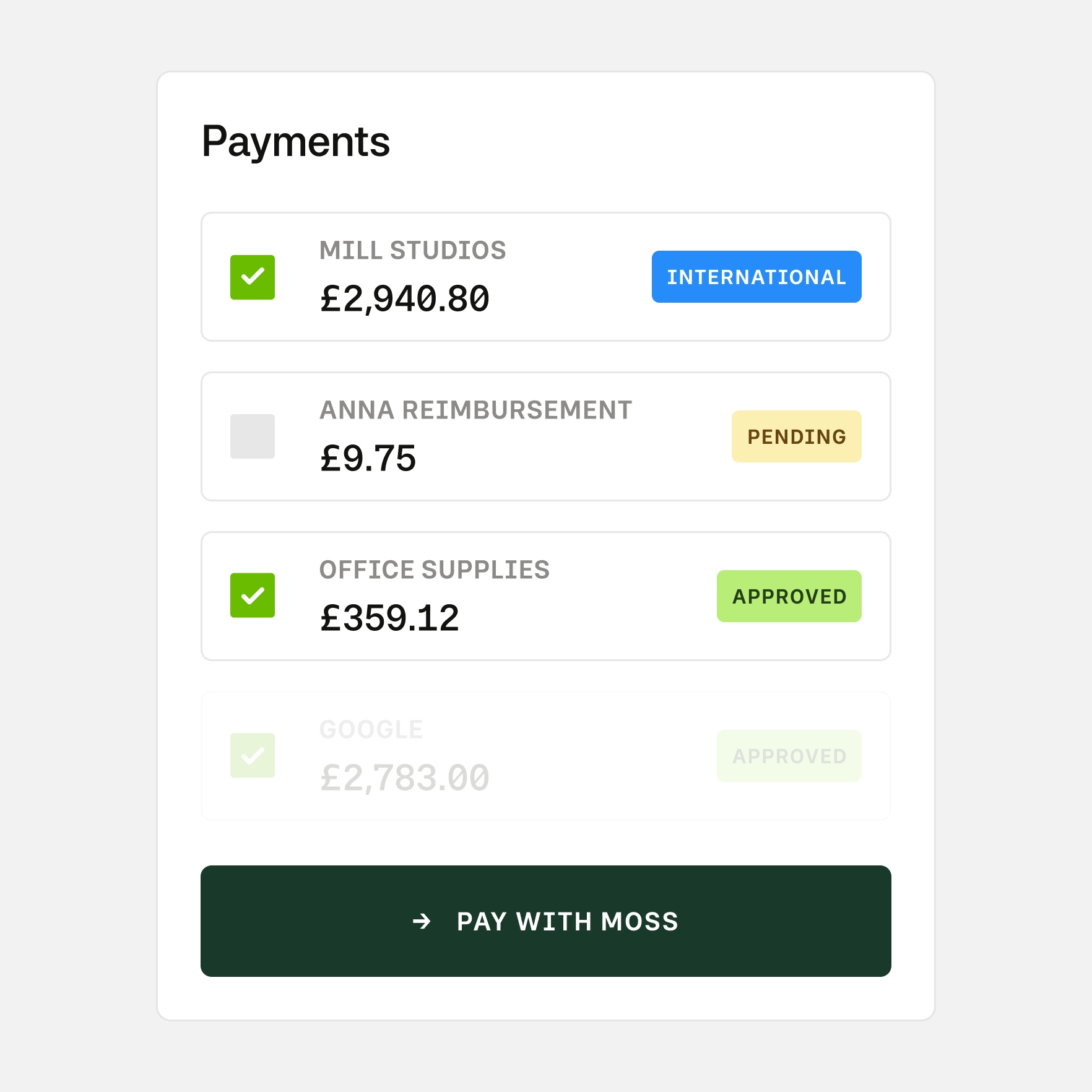 Pay with Moss prepares and executes payment runs automatically, saving time and reducing errors.