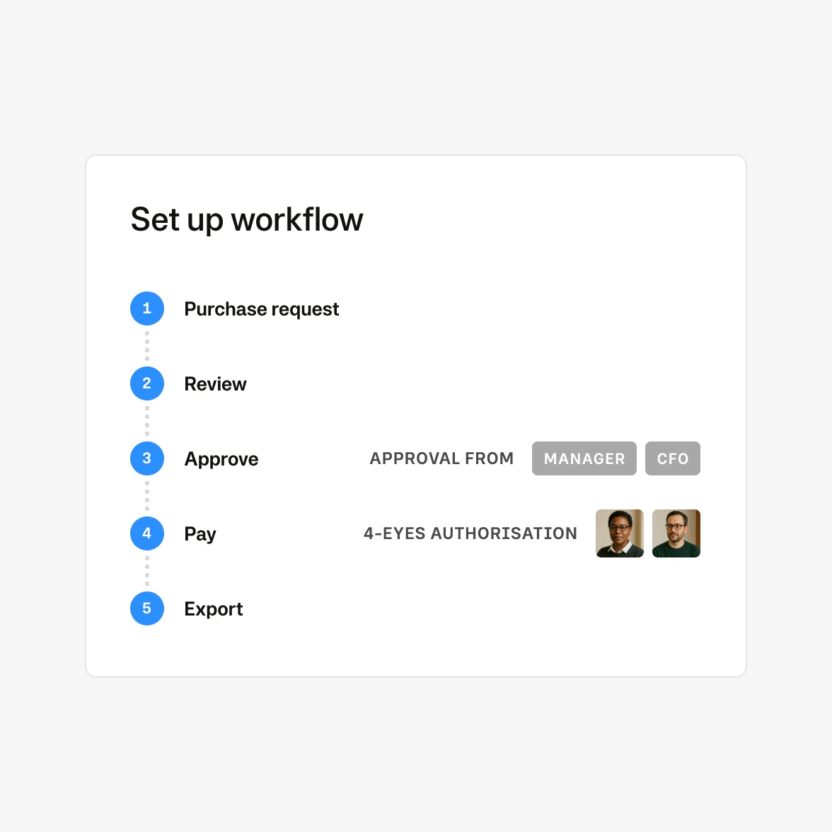 Our system allows for customisable approval workflows and spending limits, ensuring each transaction is reviewed and approved according to internal controls.
