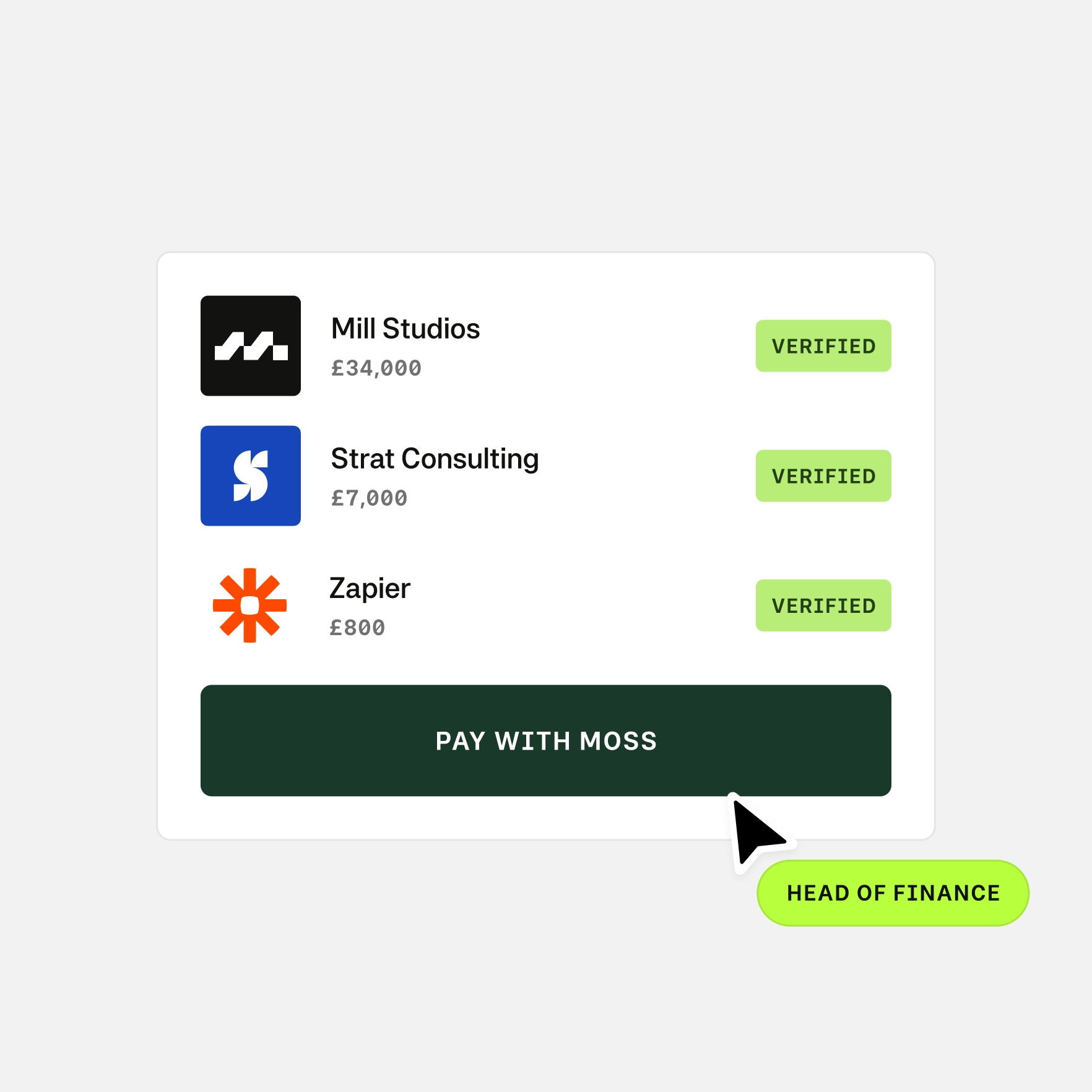 Pay invoices directly from Moss. Invoices matched with verified and pre-approved purchase requests can be paid as soon as they arrive.