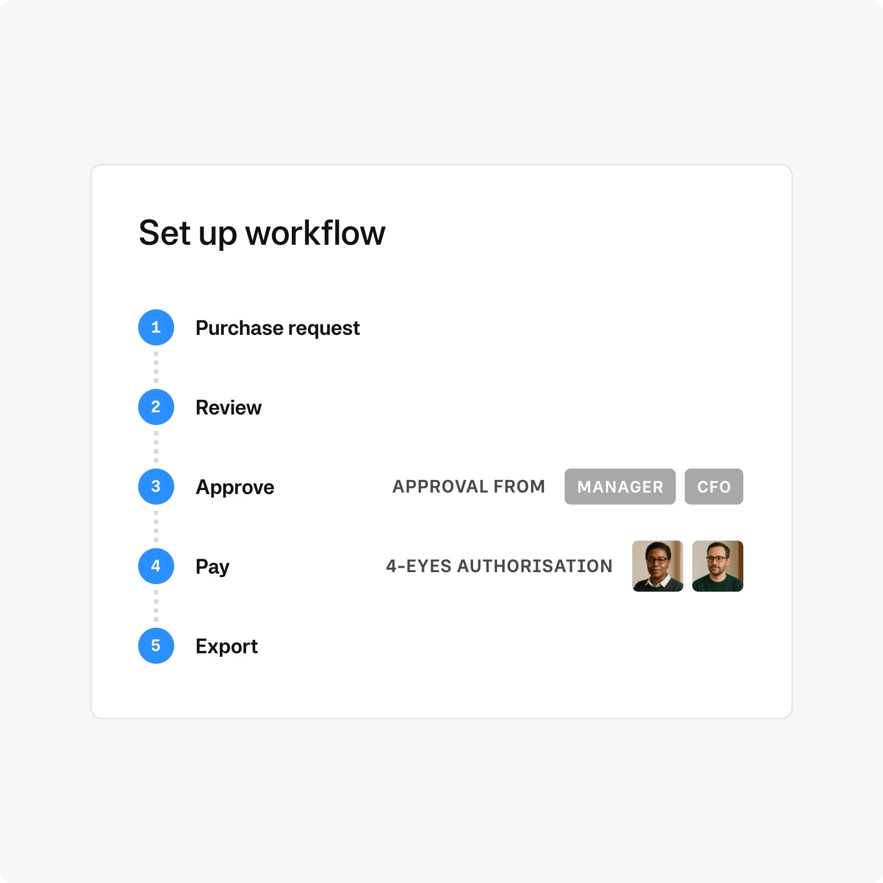 Track and manage spend across teams, departments, and entities—with role-based permissions and workflows that adapt to your organisation.