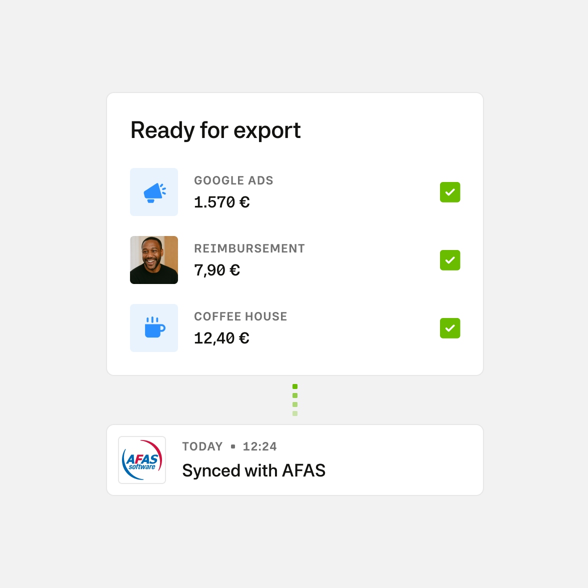 Transactions and supporting documents are stored in Moss and exported to AFAS under your control, providing a transparent, audit-ready workflow.