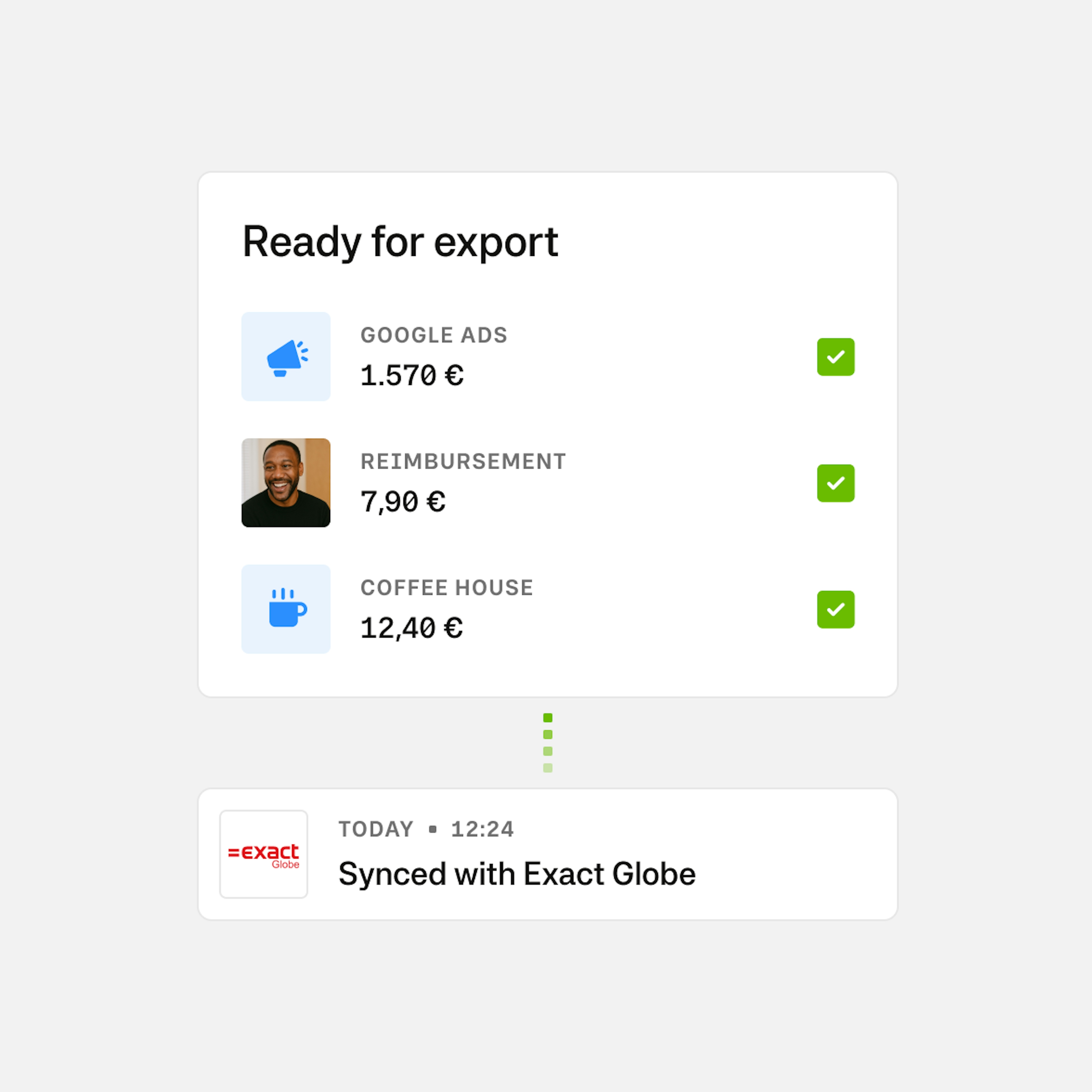 Transactions and supporting documents are stored in Moss and exported to Exact Globe under your control, providing a transparent, audit-ready workflow.