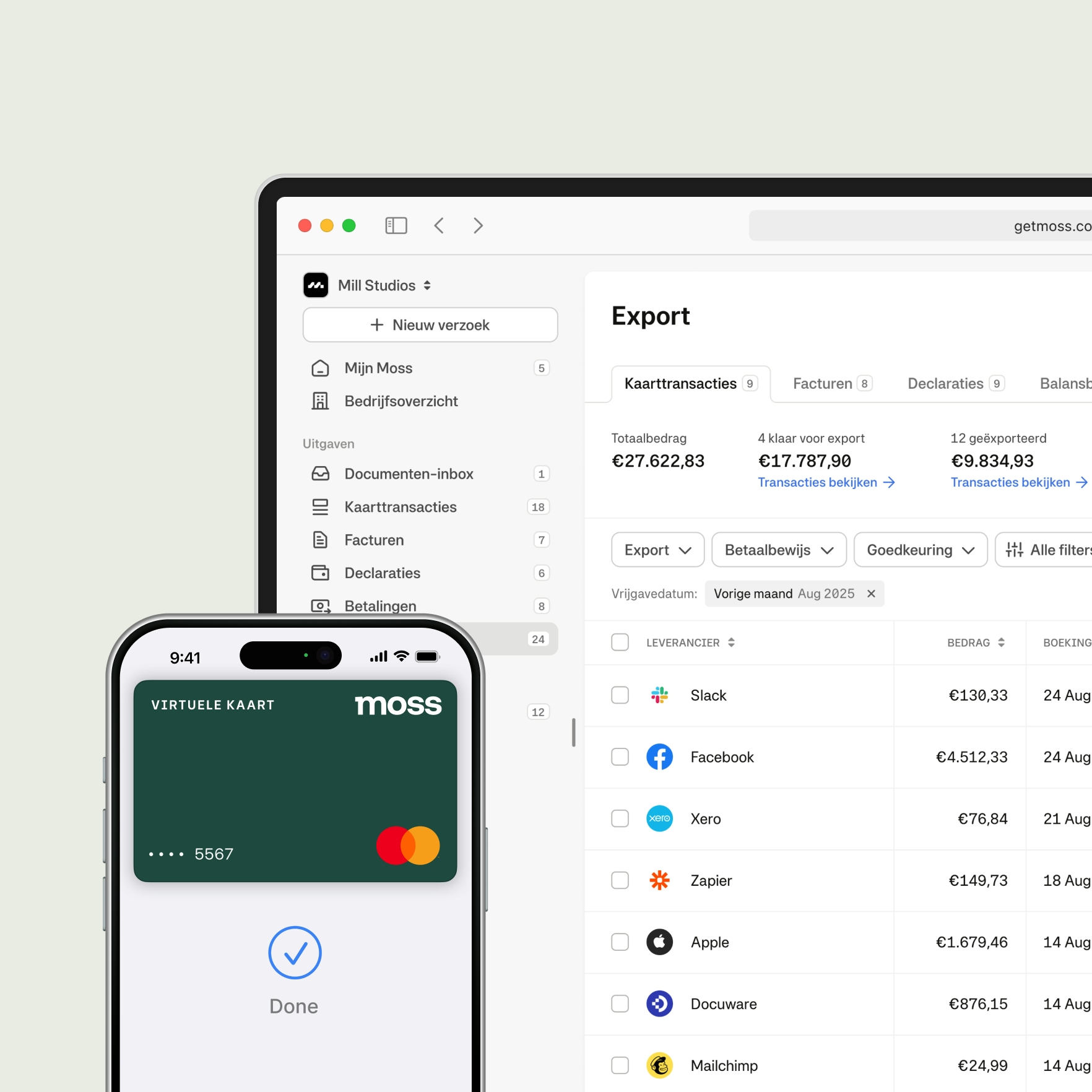 Moss is een Europees platform voor uitgavenbeheer, speciaal ontwikkeld voor kleine en middelgrote bedrijven. Het platform stroomlijnt zakelijke uitgaven door kaarten, declaraties, factuurworkflows en goedkeuringen samen te brengen in één intelligente oplossing.