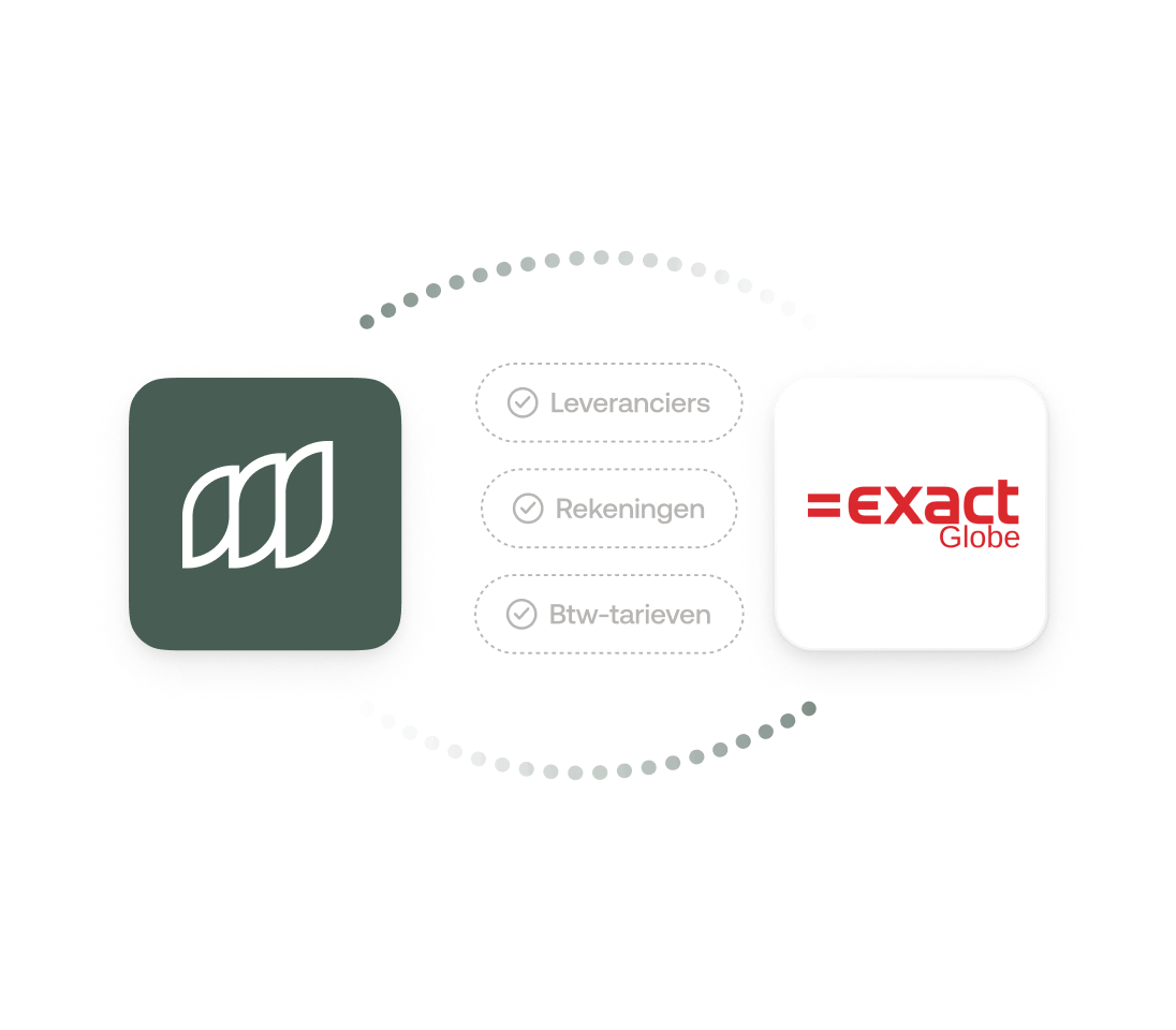 Met één klik worden het volledige rekeningschema, de leveranciers, btw-codes en kostendimensies van Exact Globe gesynchroniseerd in Moss.
