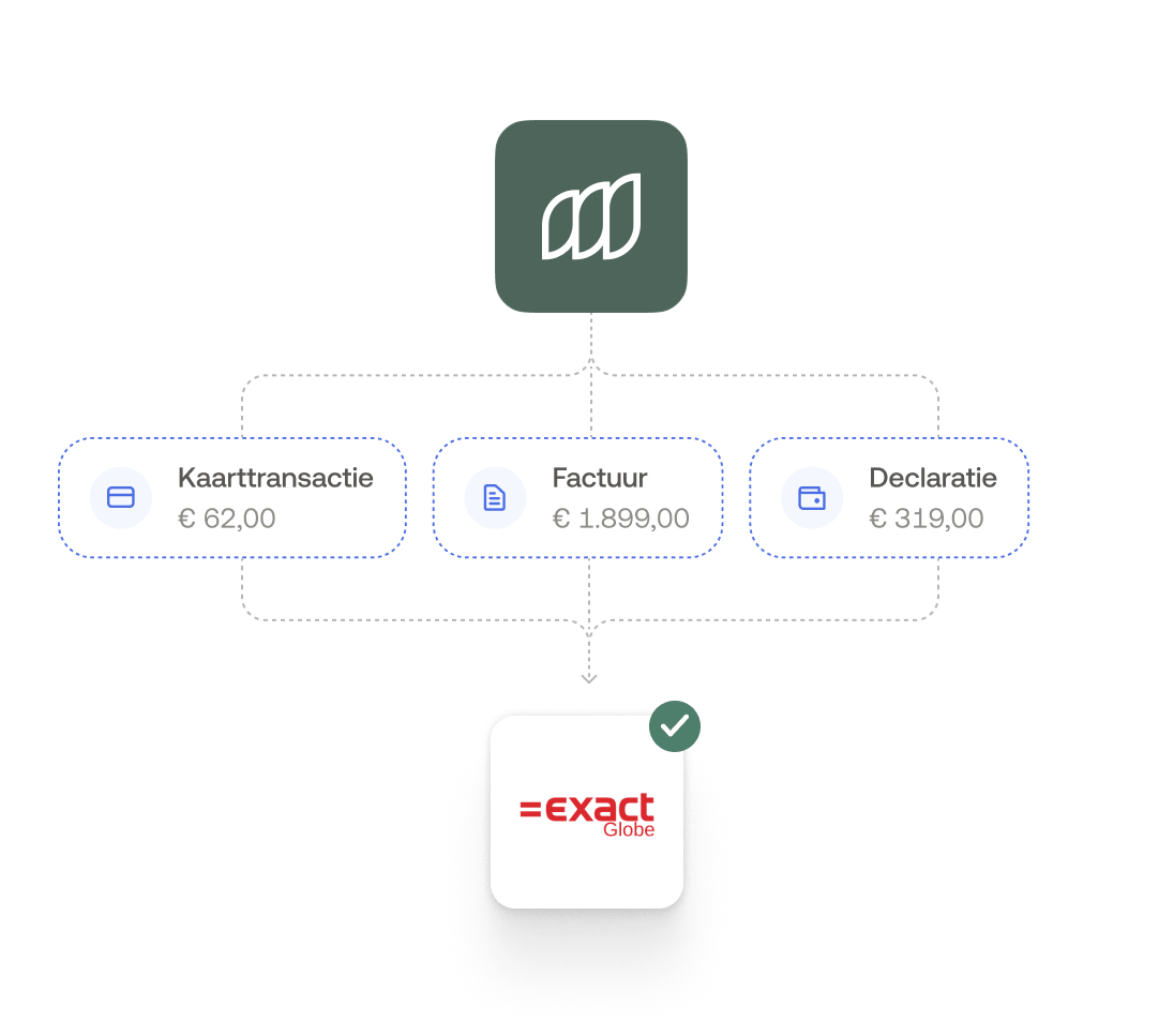 Alle kaarttransacties, facturen en declaraties worden naadloos overgebracht naar Exact Globe, inclusief bonnen en boekhoudkundige gegevens. Minimaliseer het risico op menselijke fouten en verminder de tijd die wordt besteed aan manuele reconciliatie aanzienlijk.