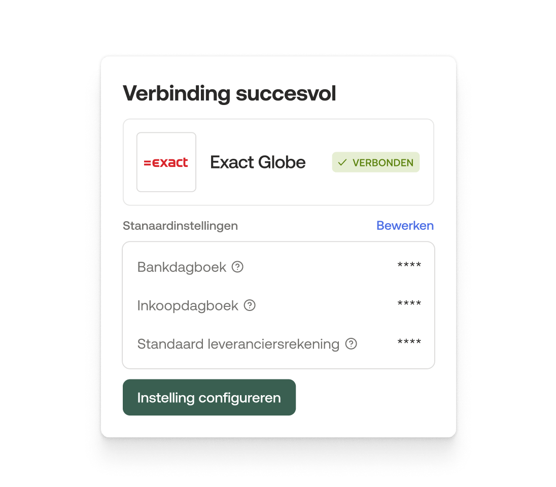 Zorg voor een naadloze integratie door je Exact Globe-account razendsnel te koppelen aan Moss met behulp van onze intuïtieve configuratiewizard. Na het voltooien van een paar vereisten is je set-up snel en soepel opgezet.