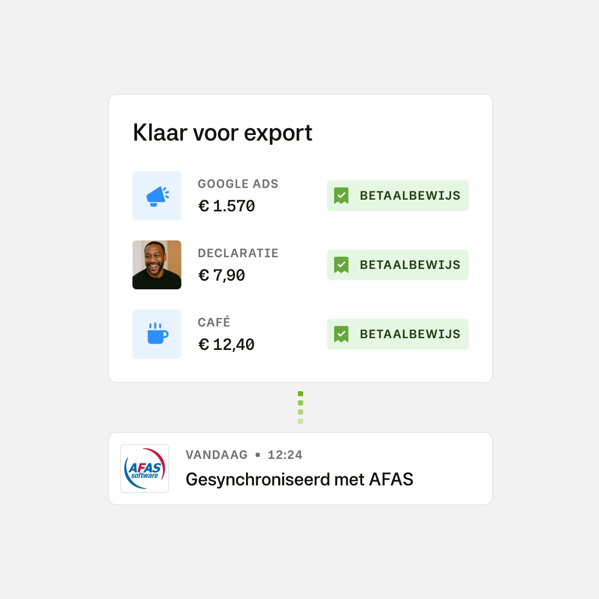 Transacties en ondersteunende documenten worden opgeslagen in Moss en onder jouw toezicht geëxporteerd naar AFAS. Voor een transparante, auditklare workflow.