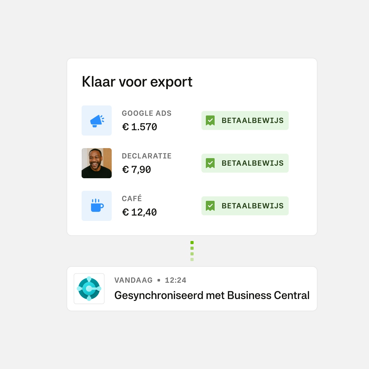 Transacties en ondersteunende documenten worden opgeslagen in Moss en onder jouw toezicht geëxporteerd naar Business Central. Voor een transparante, auditklare workflow.