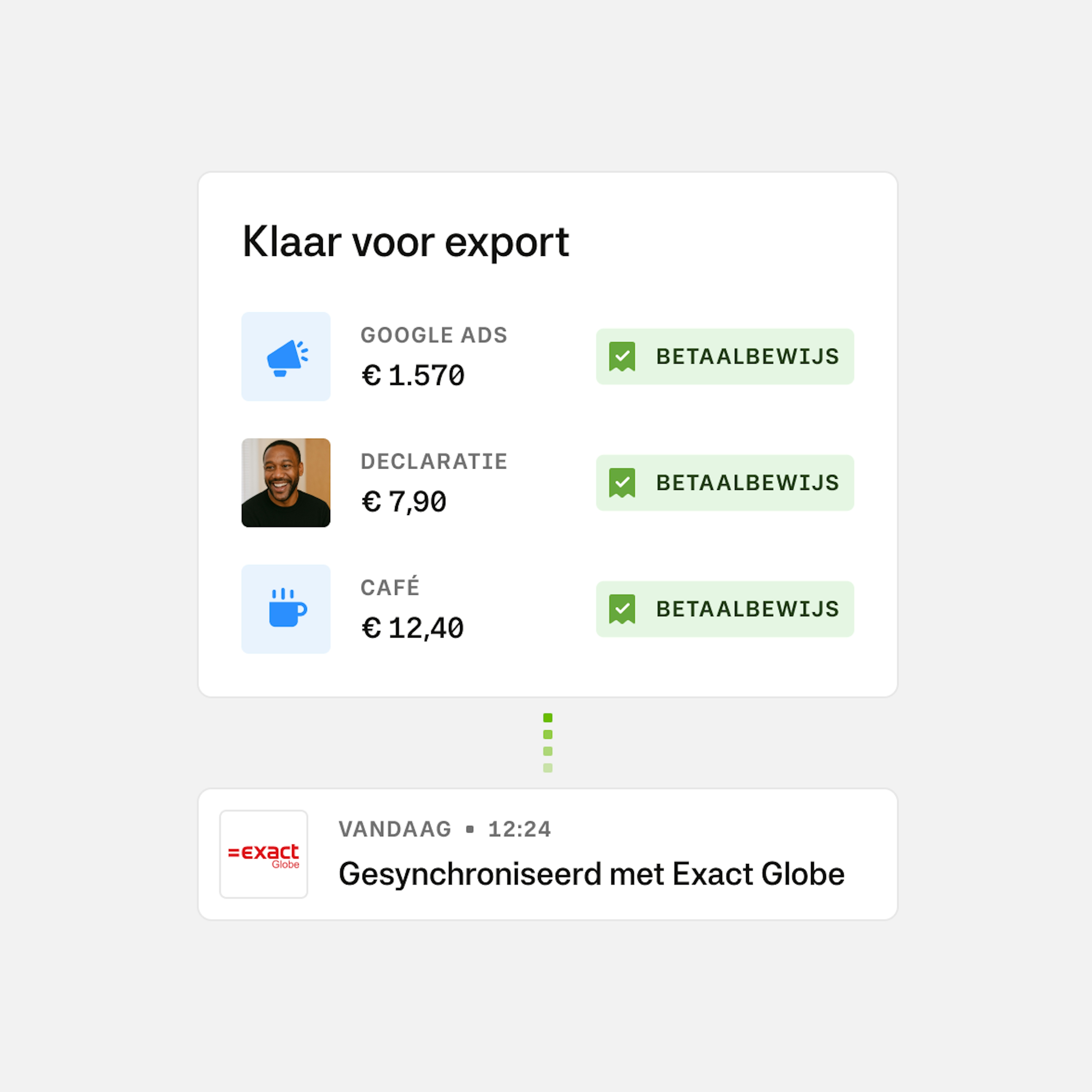 Moss koppelt de uitgaven van je bedrijf aan Exact Globe. Kaarttransacties, facturen, declaraties van werknemers en betalingen worden in Moss gecodeerd met de juiste rekeningcodes, kostenplaatsen, btw-tarieven en leveranciers, en vervolgens geëxporteerd als inkoopboekingen waarbij deze attributen al zijn toegepast.