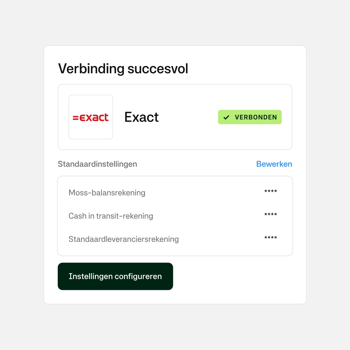 Moss houdt de grootboekrekeningen, leveranciers en btw-codes consistent met Exact Online. Correcte toewijzingen zorgen ervoor dat elke transactie op de juiste rekening terechtkomt.