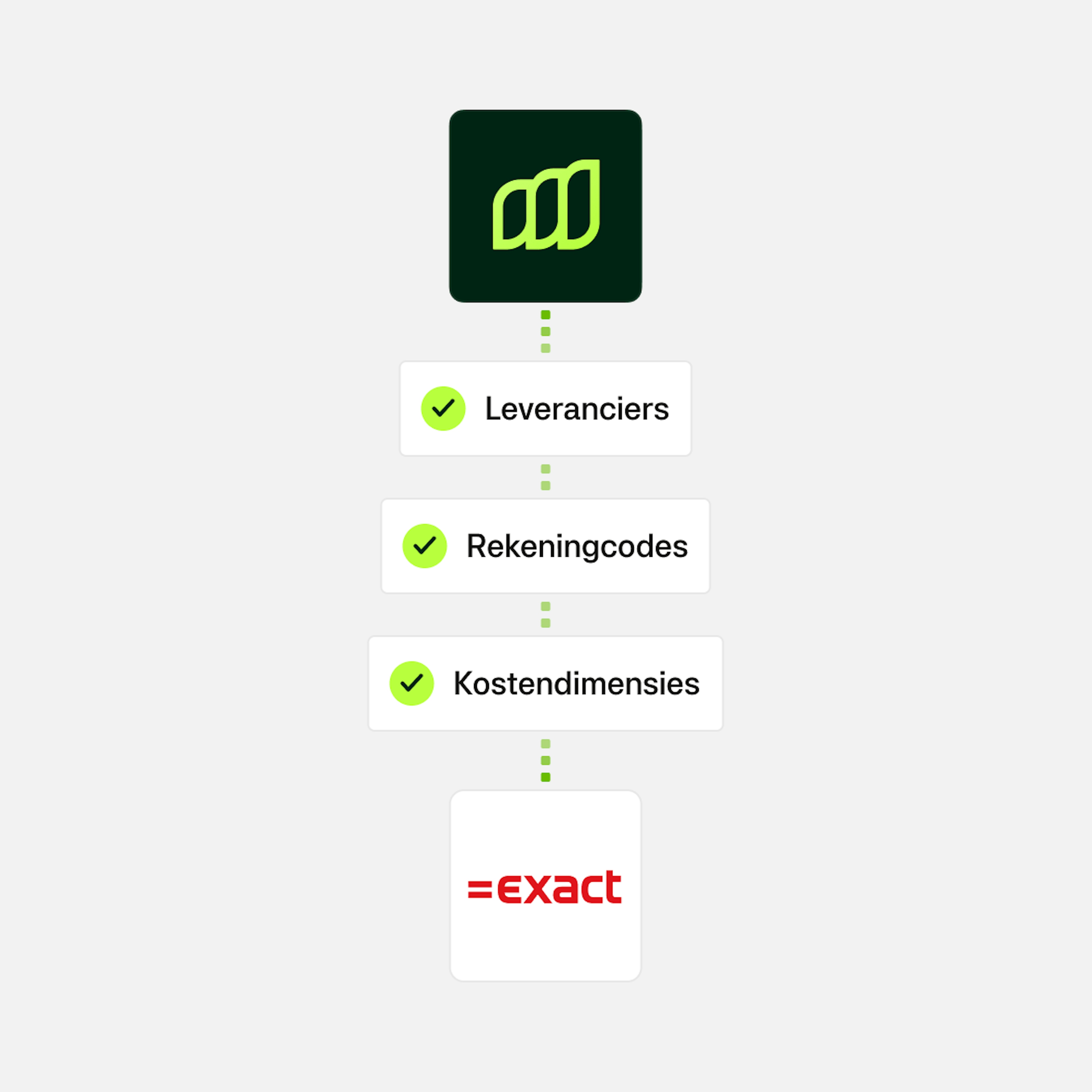 Moss exporteert kaarttransacties, declaraties, leveranciersfacturen, betalingen en betaalbewijzen. Stamgegevens zoals grootboekrekeningen, kostendimensies, leveranciers en btw-codes worden vanuit Exact Online geïmporteerd in Moss voor consistente toewijzingen.
