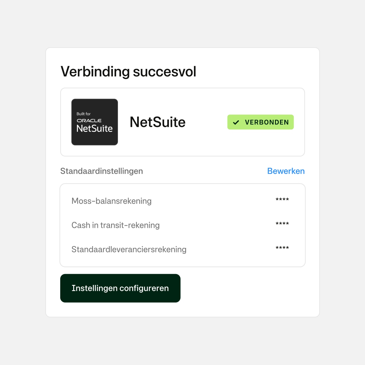 Moss is een geverifieerde NetSuite SuiteApp, wat een veilige verbinding en langdurige compatibiliteit met je ERP-configuratie garandeert.