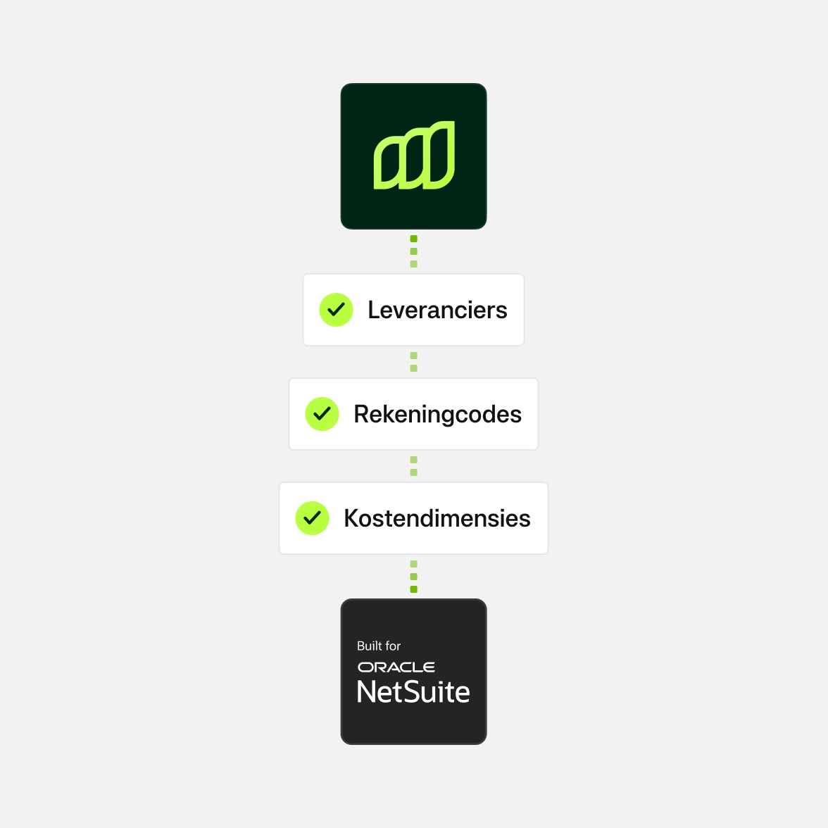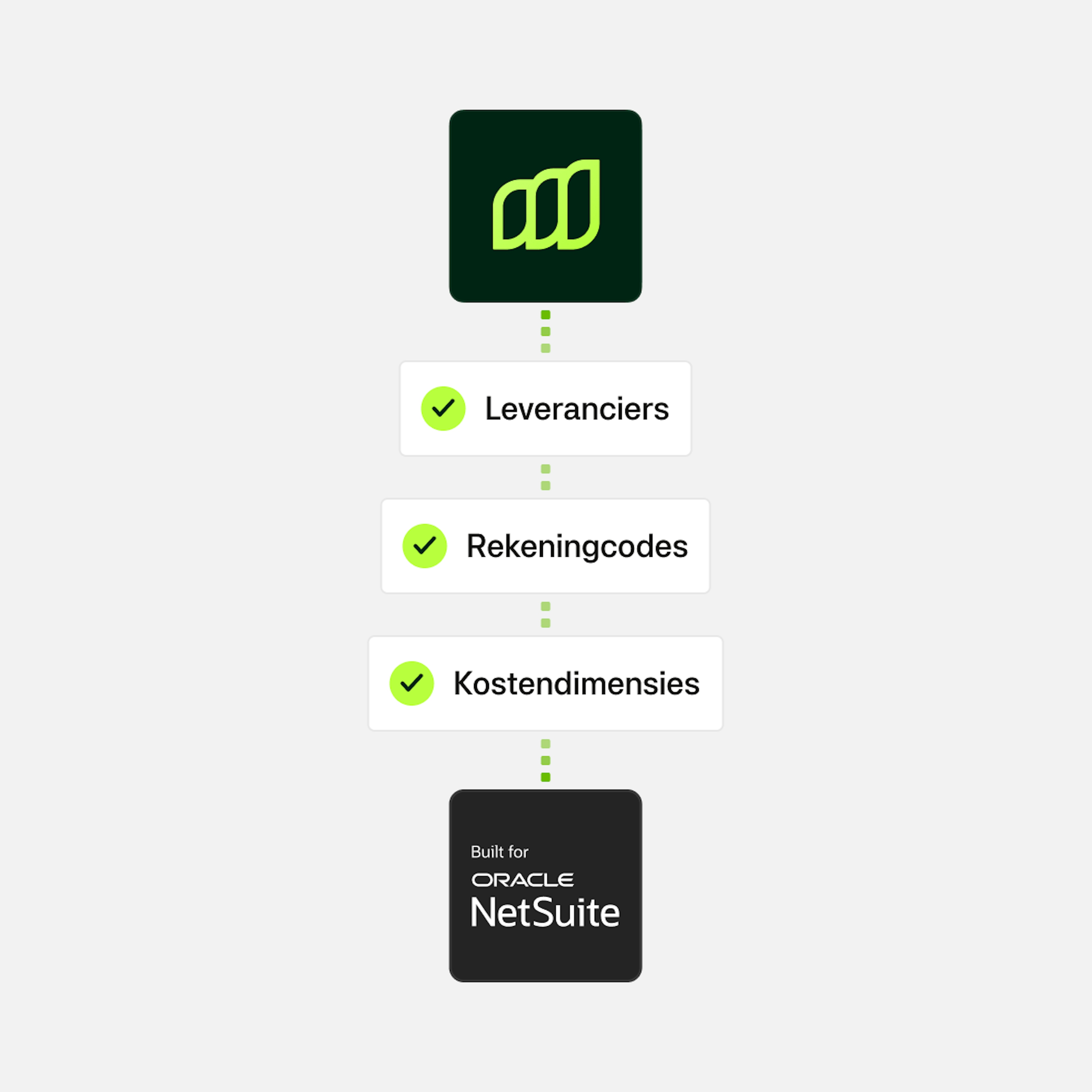 Moss exporteert kaarttransacties, declaraties, leveranciersfacturen, betalingen en betaalbewijzen naar NetSuite. Stamgegevens zoals rekeningcodes, leveranciers, belastingcodes, werknemers en NetSuite-dimensies (afdeling, klasse, locatie, aangepaste segmenten, tekstvelden) worden vanuit NetSuite geïmporteerd naar Moss.