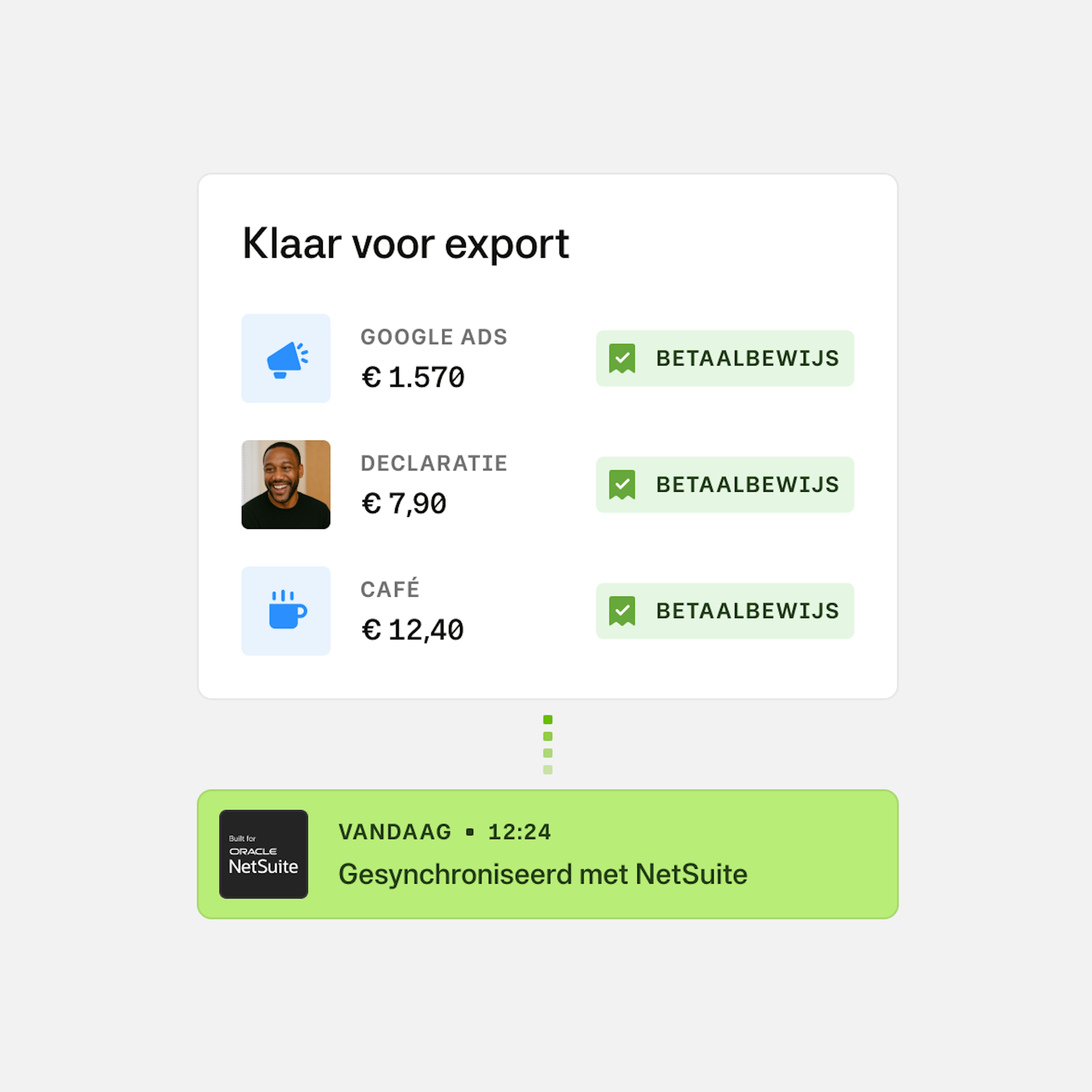 Moss beheert alle soorten uitgaven en exporteert ze naar NetSuite met de bonnen in de bijlage. Facturen van leveranciers, kaarttransacties, declaraties en betalingen zijn klaar om geboekt te worden.