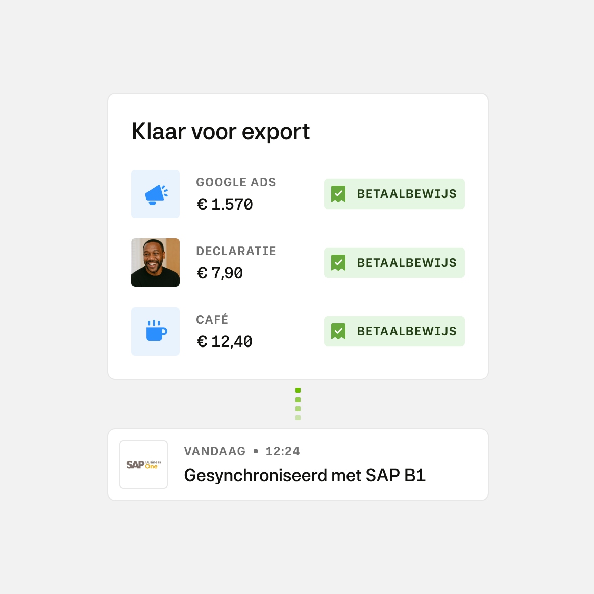 Transacties en ondersteunende documenten worden opgeslagen in Moss en onder jouw toezicht geëxporteerd naar SAP B1. Voor een transparante, auditklare workflow.