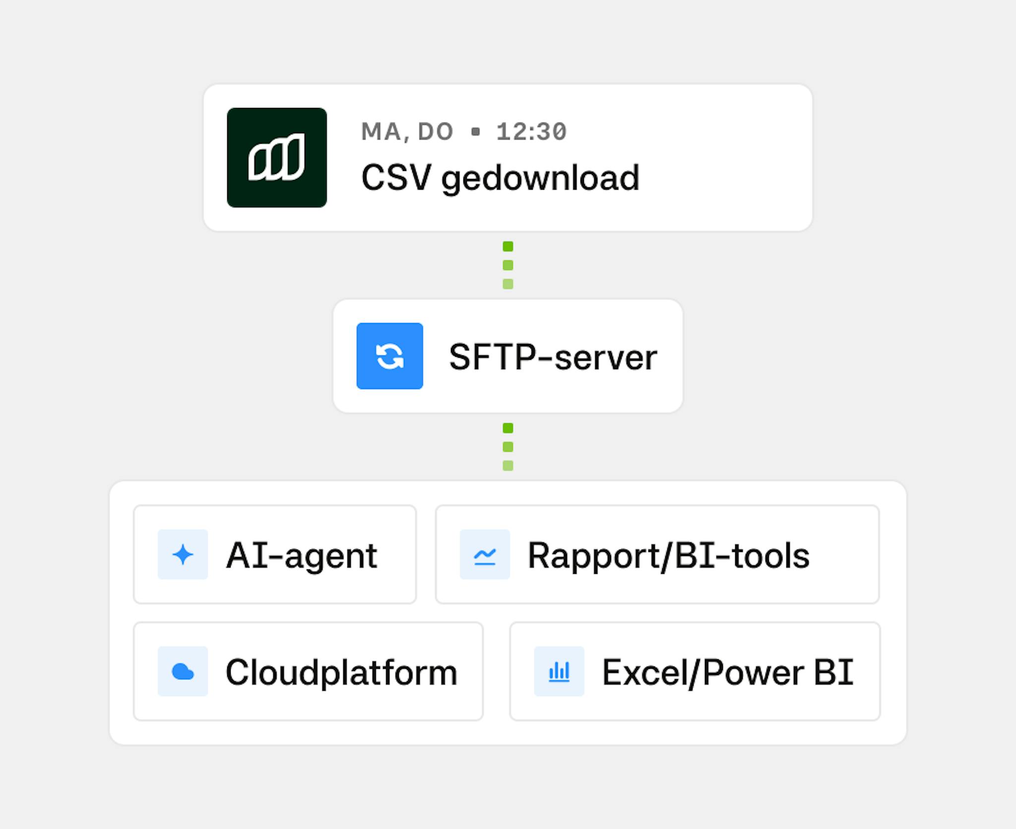 Lever automatisch Moss-uitgavengegevens zoals transacties, declaraties, aankoopverzoeken en bijlagen aan de SFTP-server van je bedrijf, volgens een zelfgekozen schema. Kies de datasets die je nodig hebt, bepaal hoe vaak ze worden verzonden en ontvang ze in een veilig, direct bruikbaar formaat voor BI-tools, ERP’s of documentarchieven.