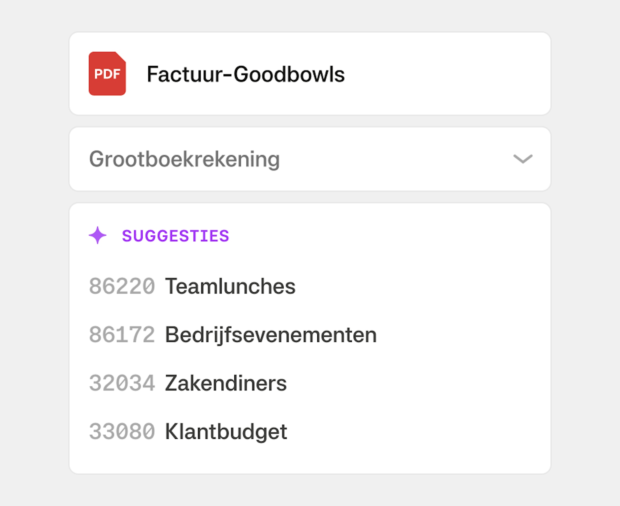 Moss helpt klanten nu nog sneller bij het toewijzen van boekhoudkundige attributen aan uitgaven. Wanneer Moss detecteert dat een waarde contextafhankelijk is, toont het een shortlist van waarschijnlijke opties om uit te kiezen. Als de voorgestelde waarde aangepast moet worden, zijn de meest relevante alternatieven direct beschikbaar — dit bespaart tijd bij het zoeken of scrollen door lange lijsten. Een eenvoudige manier om echte beslissingen tijdens het coderen sneller en makkelijker te maken.