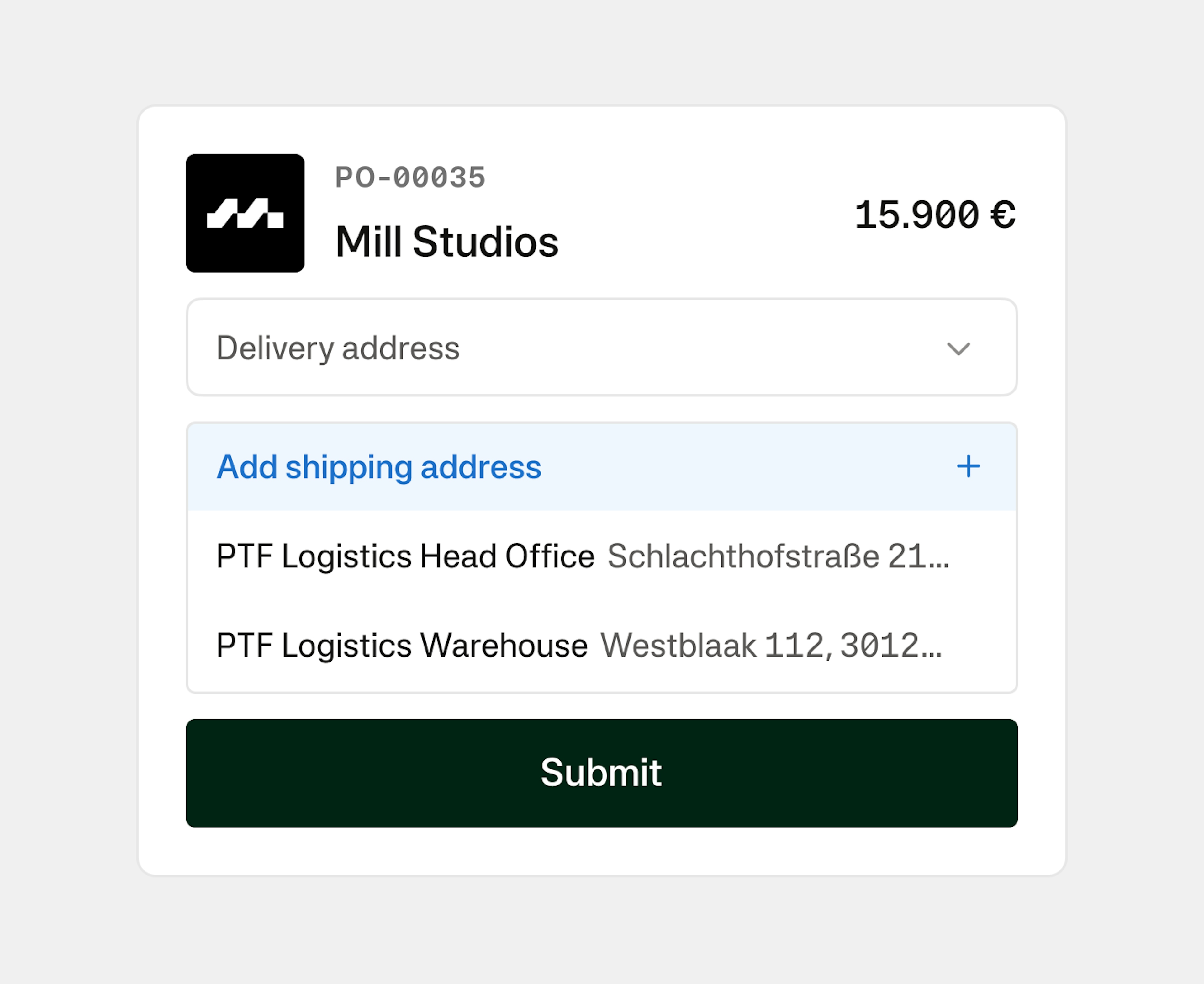 De afleveradressen op inkooporders in Moss kun je voortaan aanpassen, zodat bestellingen altijd op de juiste locatie aankomen. In plaats van één adres voor het hele bedrijf kunnen admins nu verschillende afleverlocaties beheren voor verschillende kantoren of magazijnen. Bij het aanmaken van een inkooporder kiezen gebruikers dan gewoon het juiste adres. Het resultaat: een nauwkeuriger en flexibeler inkoopproces voor finance en inkoopteams.