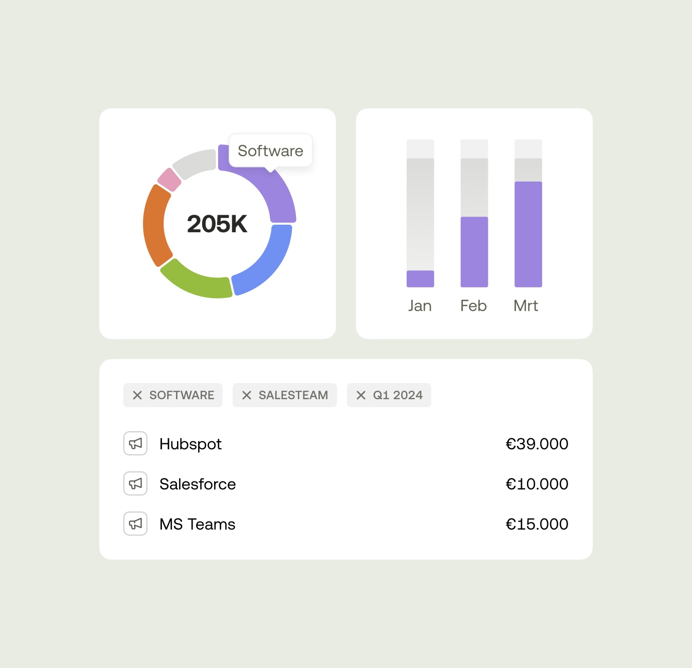Krijg een volledig beeld van je uitgaven met visuele overzichten en gedetailleerde verdelingen die trends onthullen en potentiële besparingen identificeren.