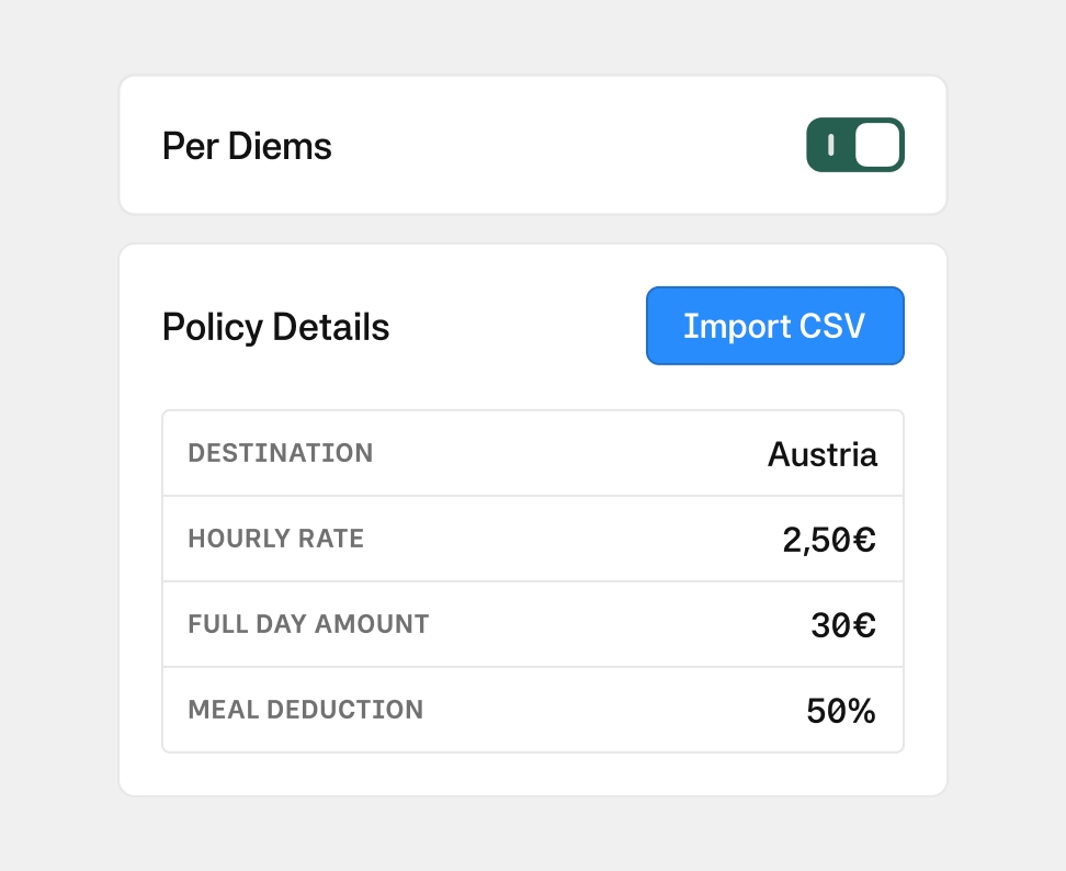Managing per diems just got easier. Moss now supports custom per diem policies for Germany and Austria. You can now configure custom per diem rates to match your policies — from allowances per destination to meal deductions. All updates are logged for full compliance. The calculation logic in Moss already supports the most common per diems for germany and Austria but continues to expand support for less common allowance and deduction rules, so every business can stay compliant with its specific agreements.