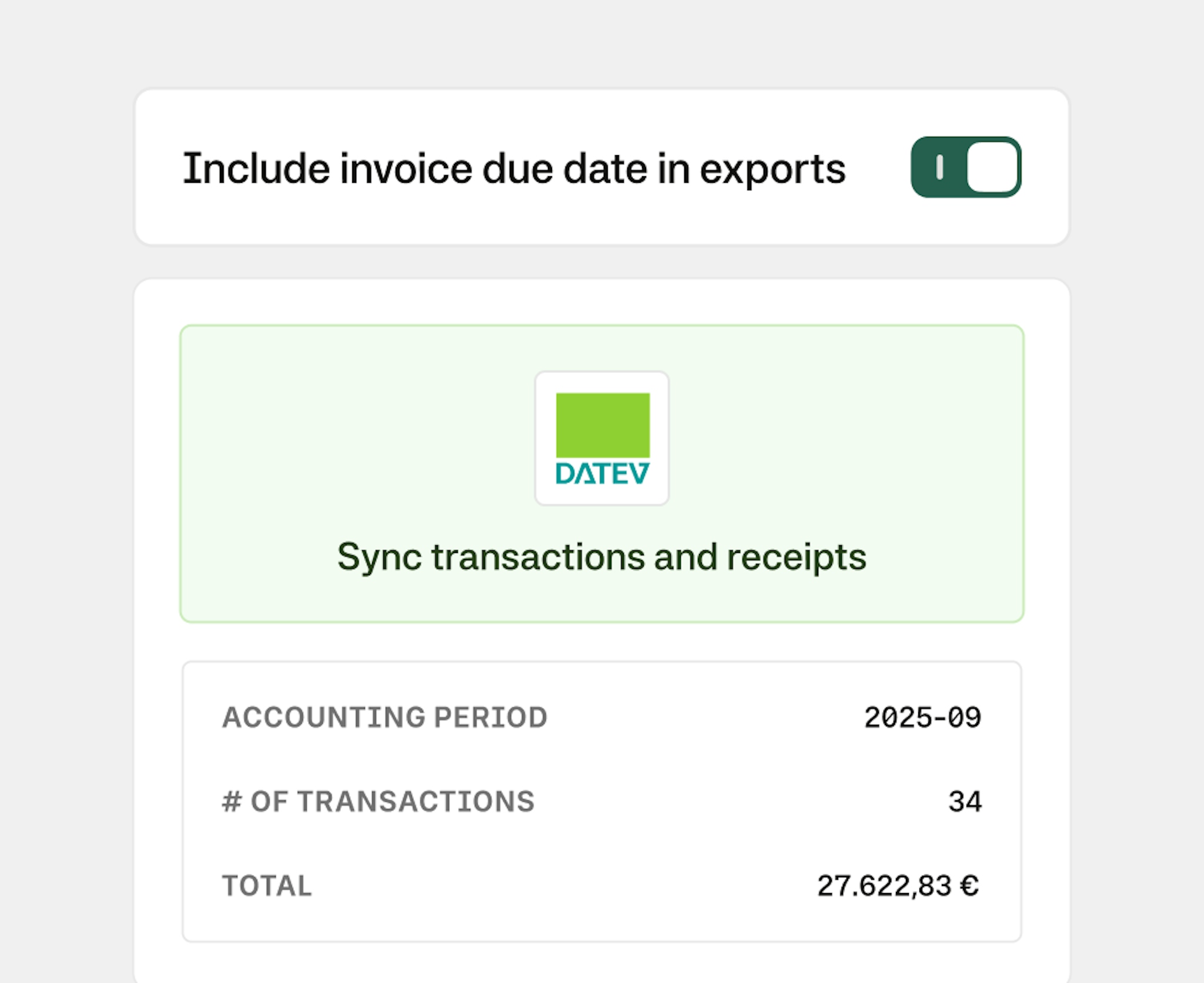 We’ve expanded our integration with DATEV Unternehmen Online to make exports smoother and reduce manual work. Updates include: service dates for card transactions, an optional Due Date export, booking texts over 60 characters as attachments, compatibility with account length changes across fiscal years, and the option to override the export folder name. These updates give Finance teams more flexibility and reduce manual effort in their workflows.