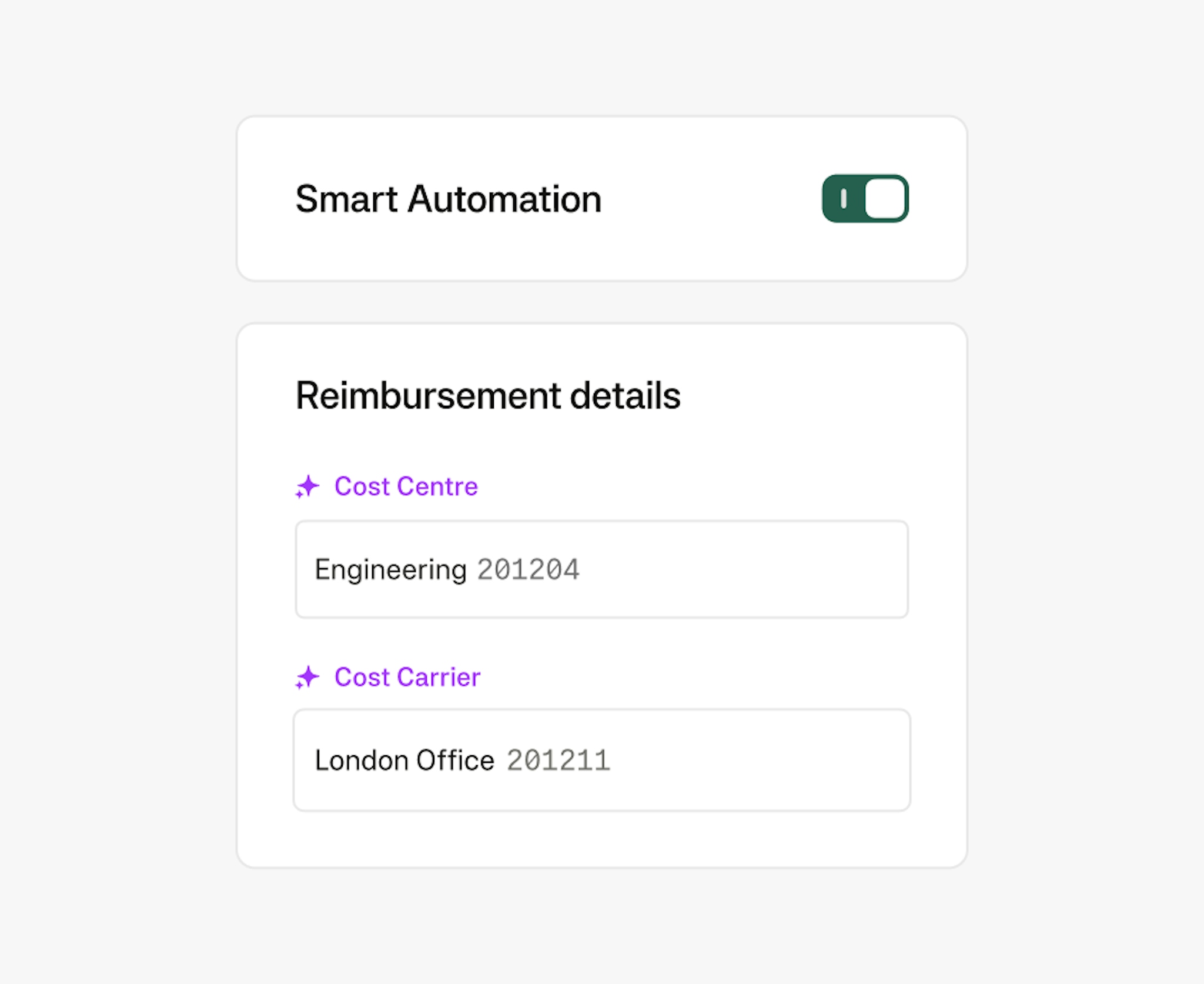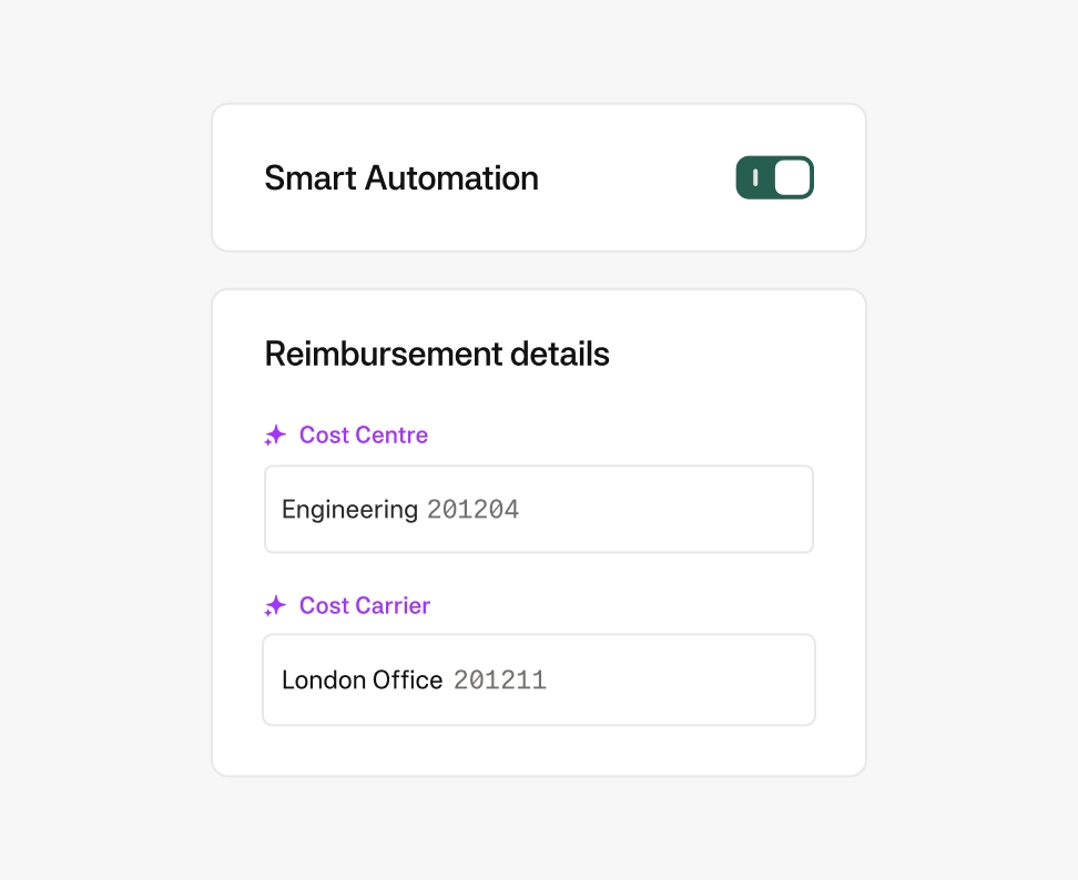 Streamline your employee reimbursements with Smart Automation, which uses AI to automatically assign accounting attributes, and more to reimbursements. This feature adapts to your company's unique rules and practices, pre-coding the majority of reimbursements to save time and reduce manual effort.